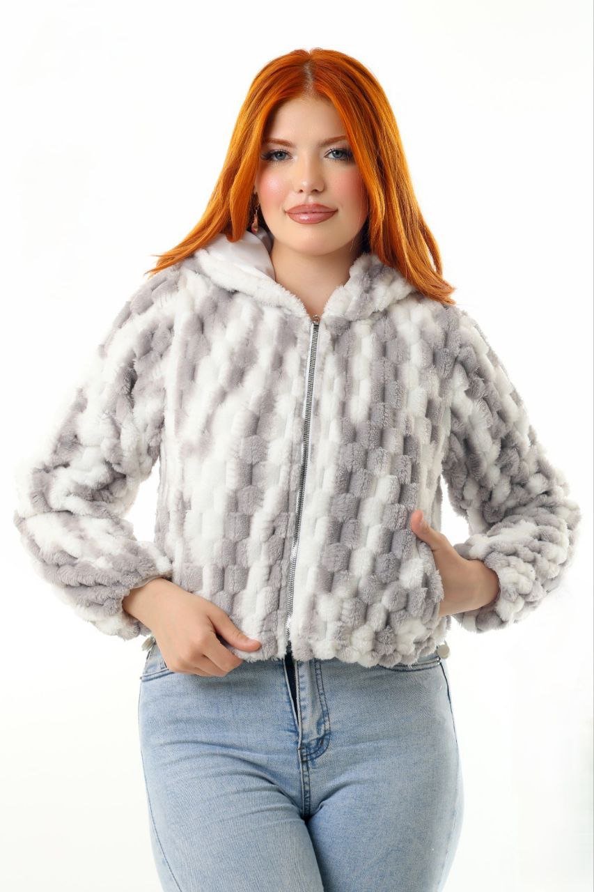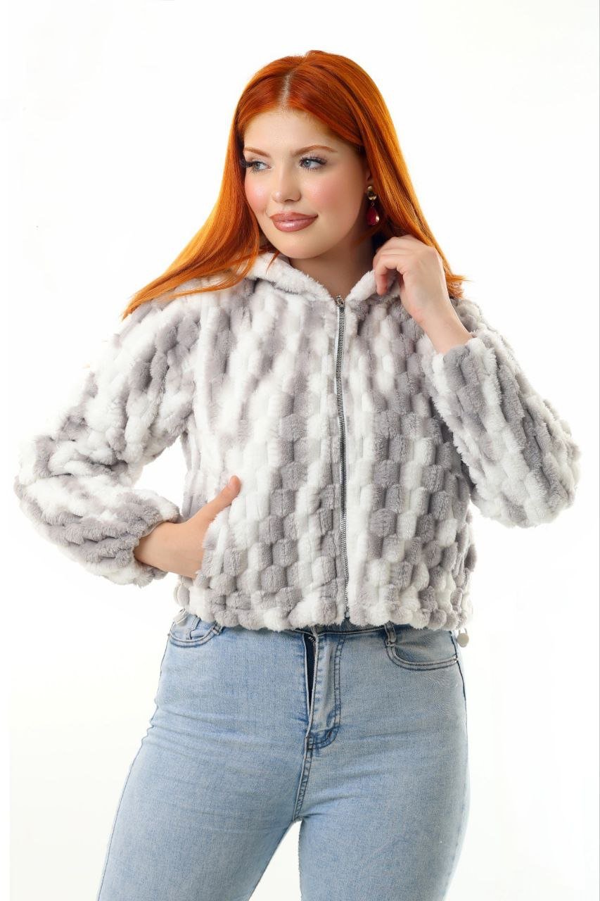 This women’s faux-fur jacket offers a modern Grey & White shade with a beautifully textured ribbed pattern. Made with ultra-soft, warm faux-fur fabric, it delivers a cozy feel while maintaining a lightweight, comfortable fit. The jacket includes a smooth front zipper, warm inner lining, and long plush sleeves for maximum winter comfort.