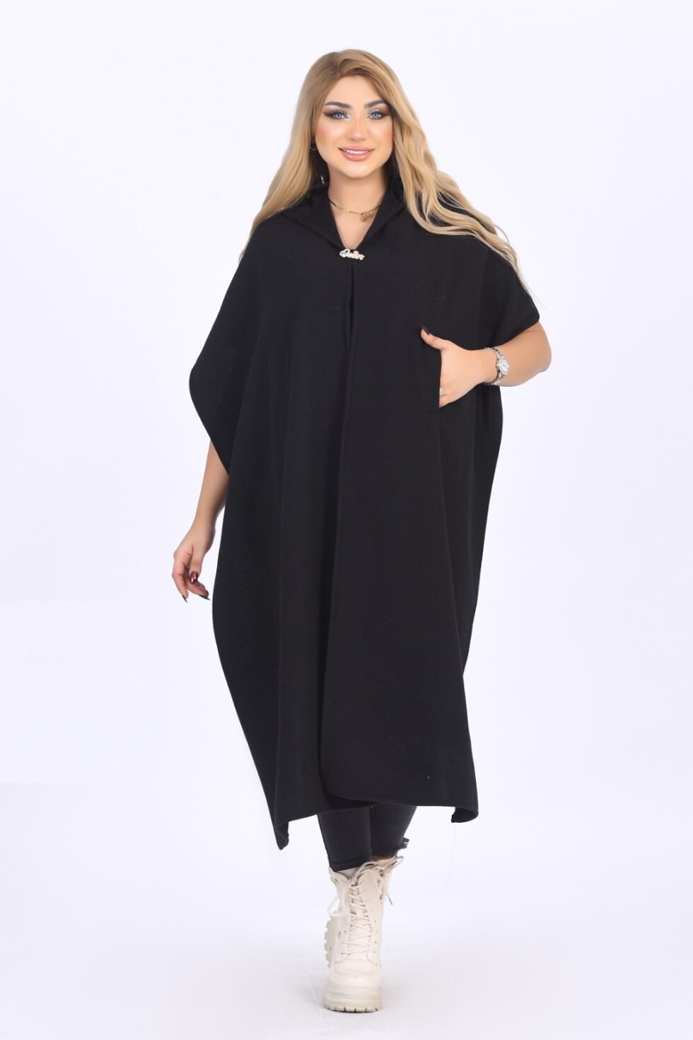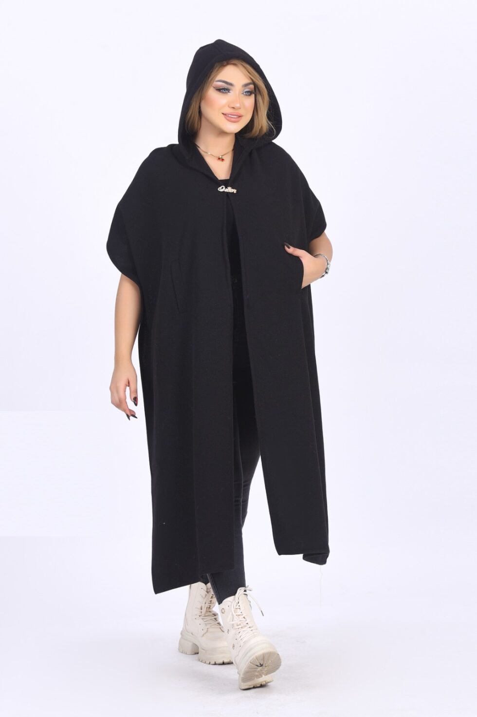Elegant hooded winter shawl made from warm wool/jokh material. One-size design with a flowing cut, soft texture, and a stylish front opening.