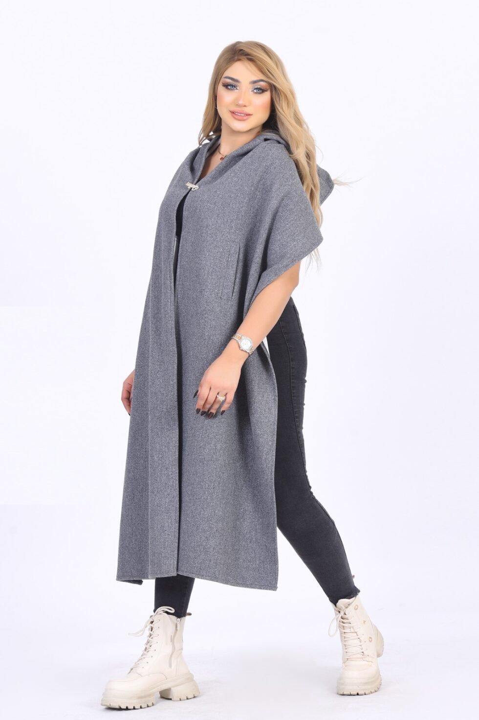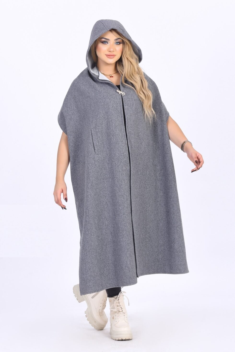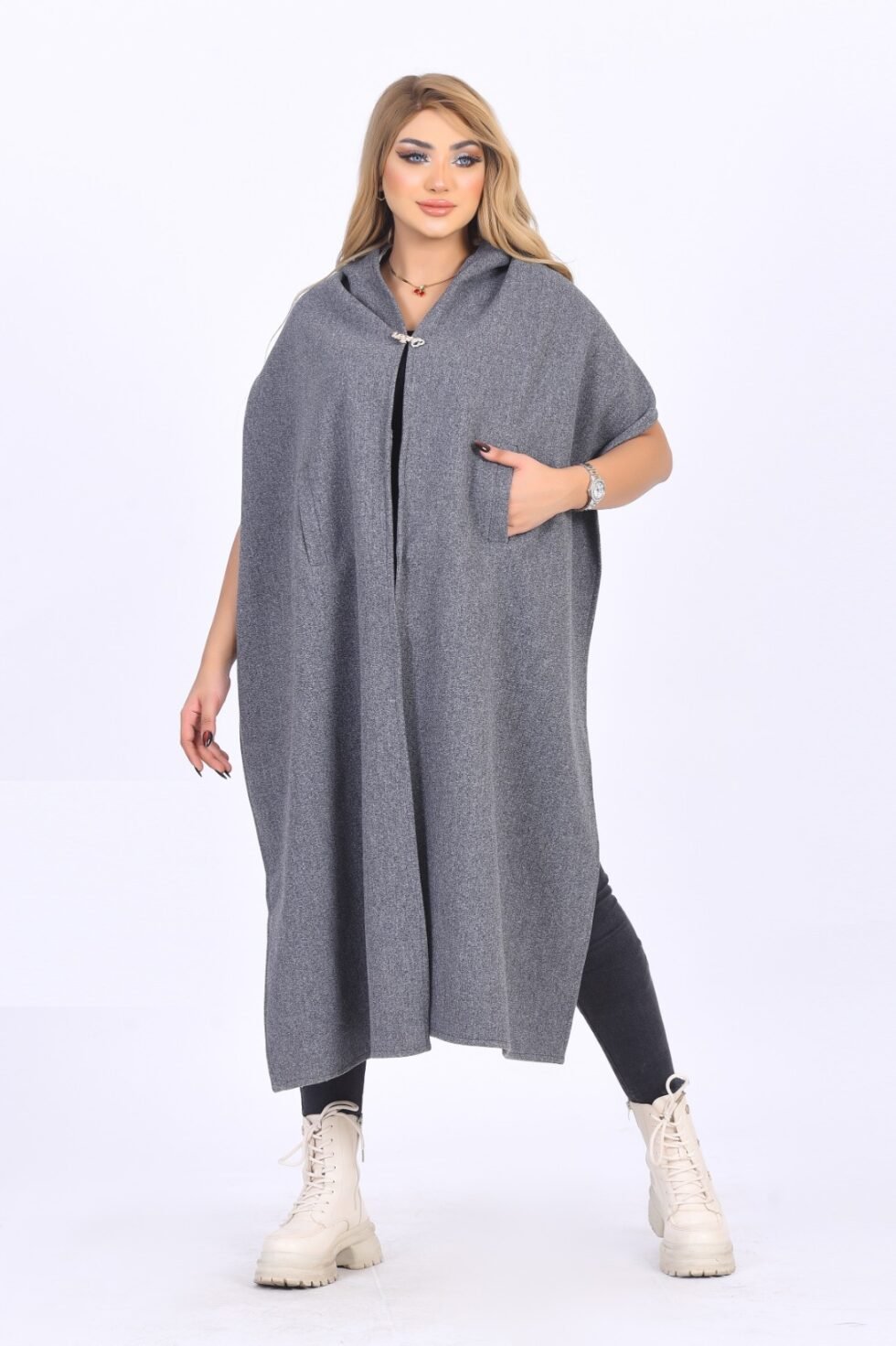 Elegant hooded winter shawl made from warm wool/jokh material. One-size design with a flowing cut, soft texture, and a stylish front opening.