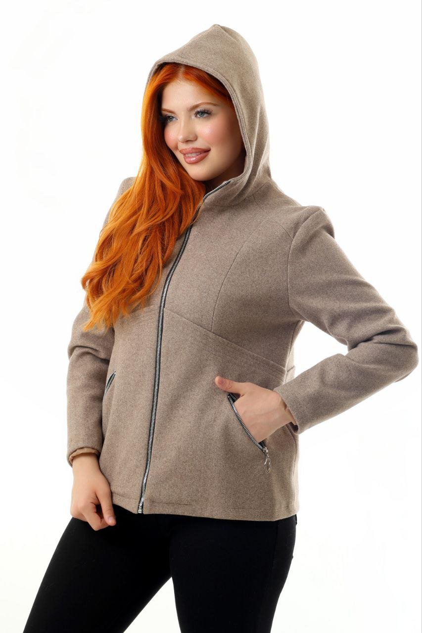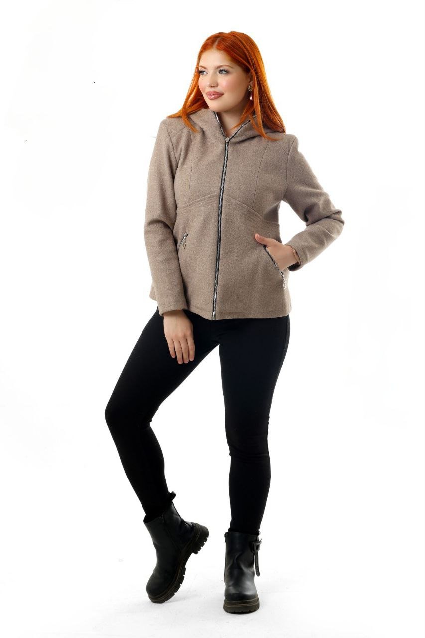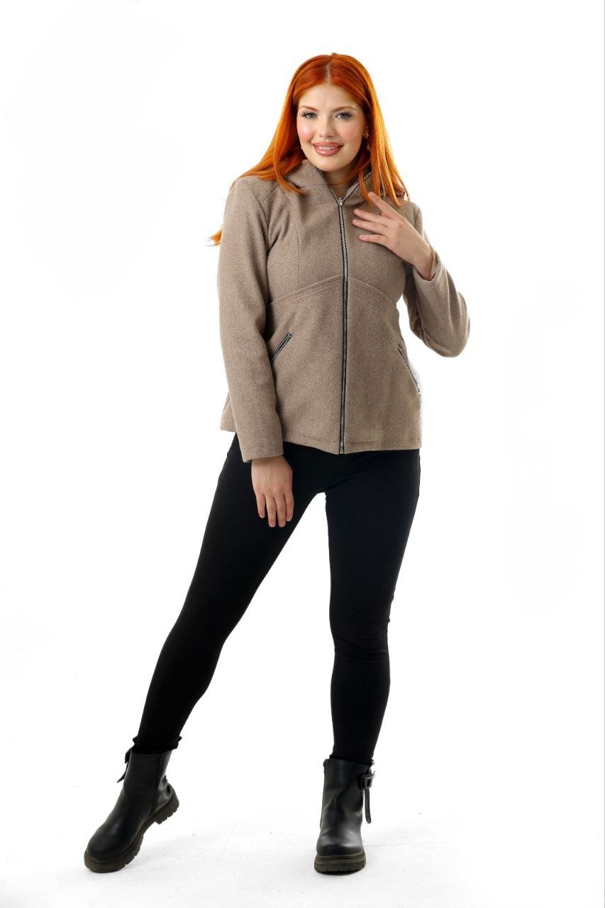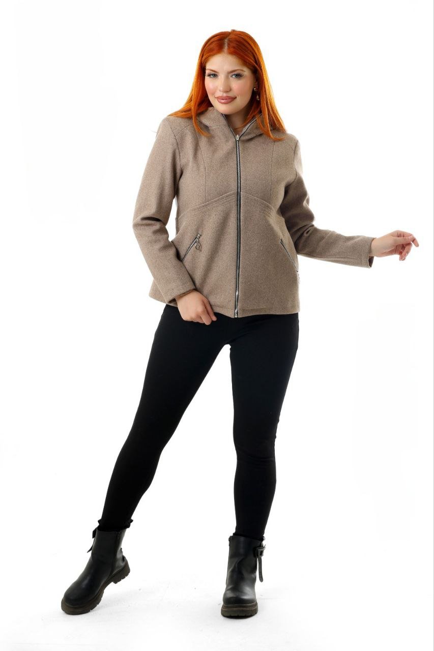 A stylish taupe winter jacket made from soft wool-style fabric, featuring a clean full-zip design, practical pockets, and a warm, comfortable fit.