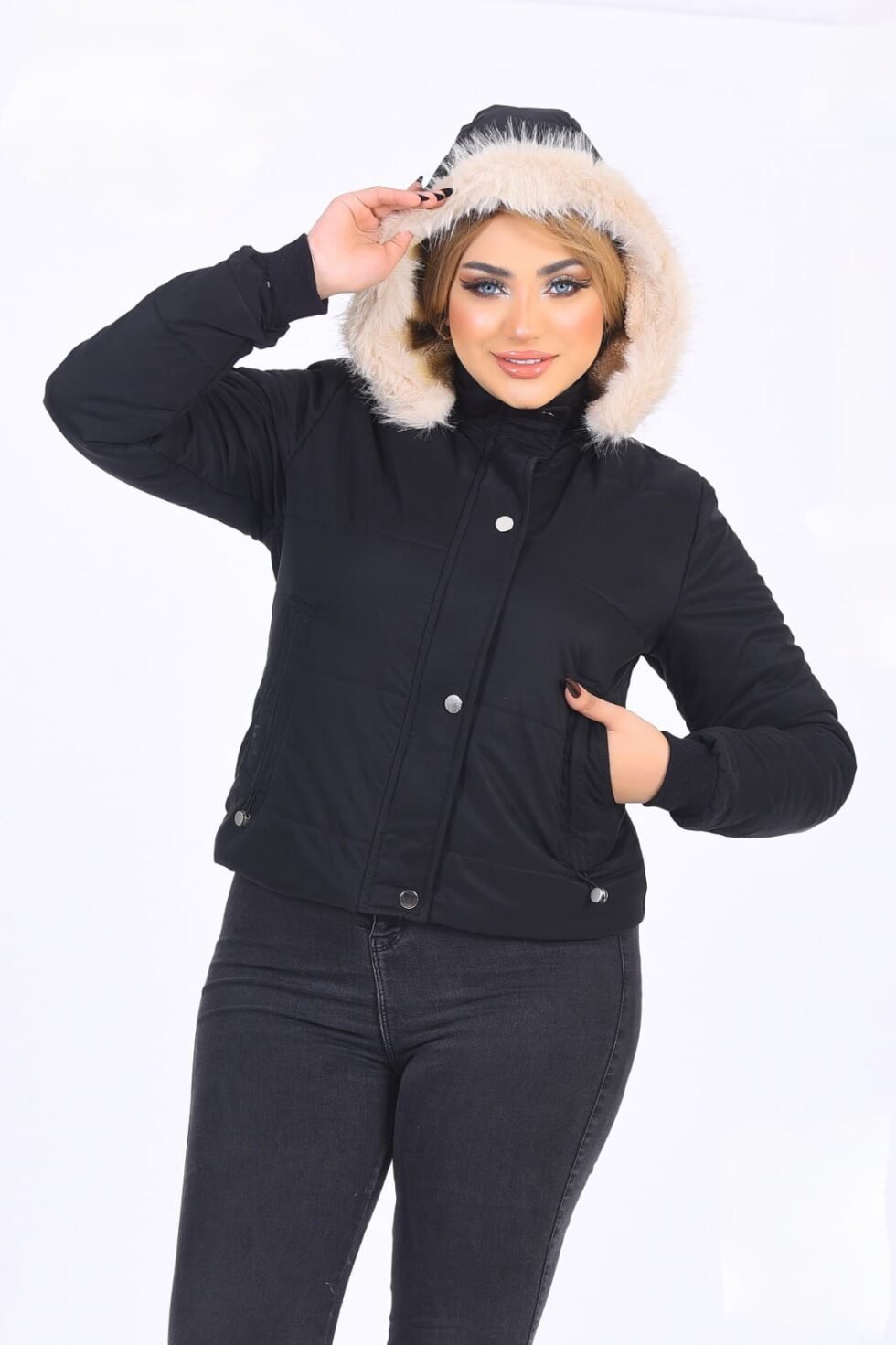 The hood is trimmed with luxurious faux fur, adding both elegance and extra protection against cold wind.