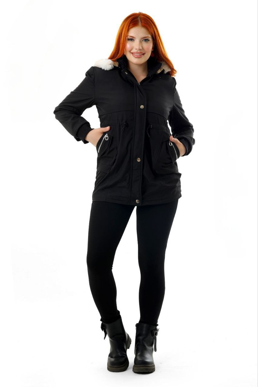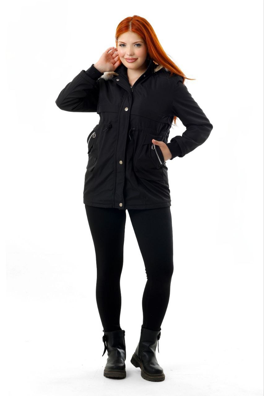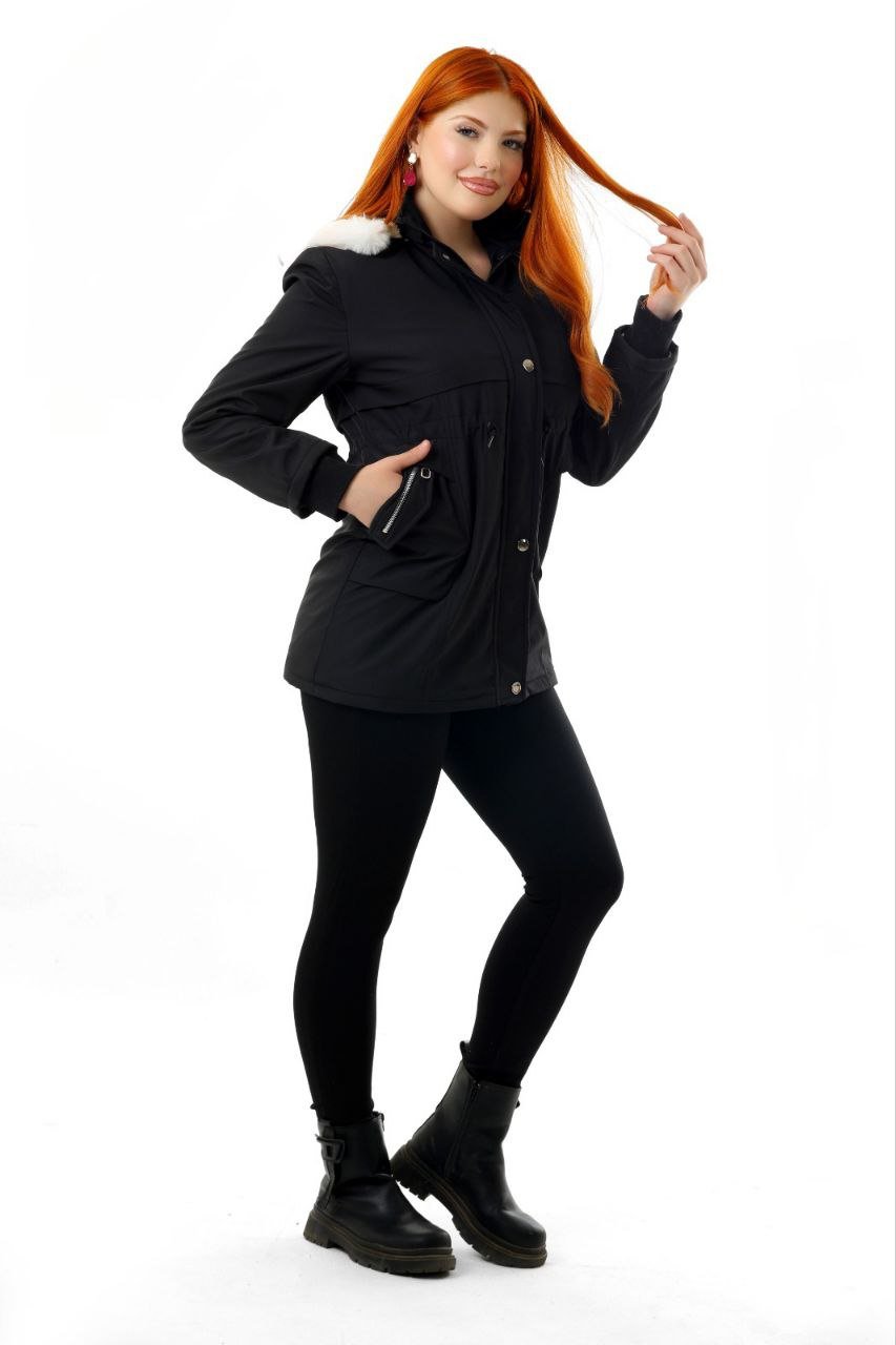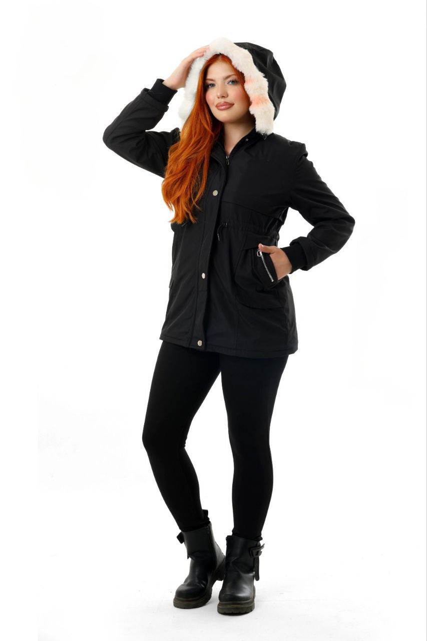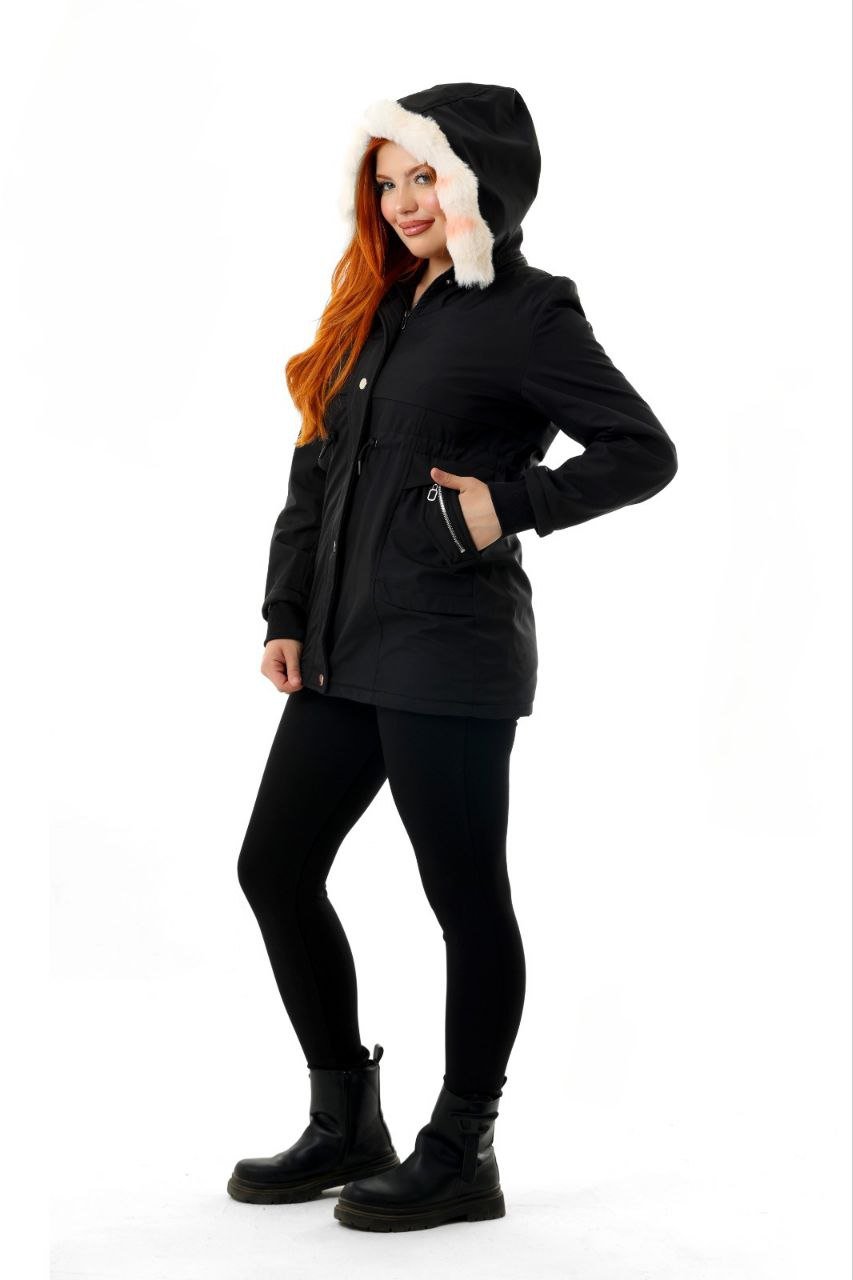 This women’s long waterproof winter jacket provides excellent protection against cold, wind, and rain. Designed with a stylish Black exterior and a soft fur-lined hood, it combines warmth with a clean, modern look. The jacket features a full zipper with snap buttons, adjustable waist drawstrings for a tailored fit, and multiple spacious pockets for convenience.