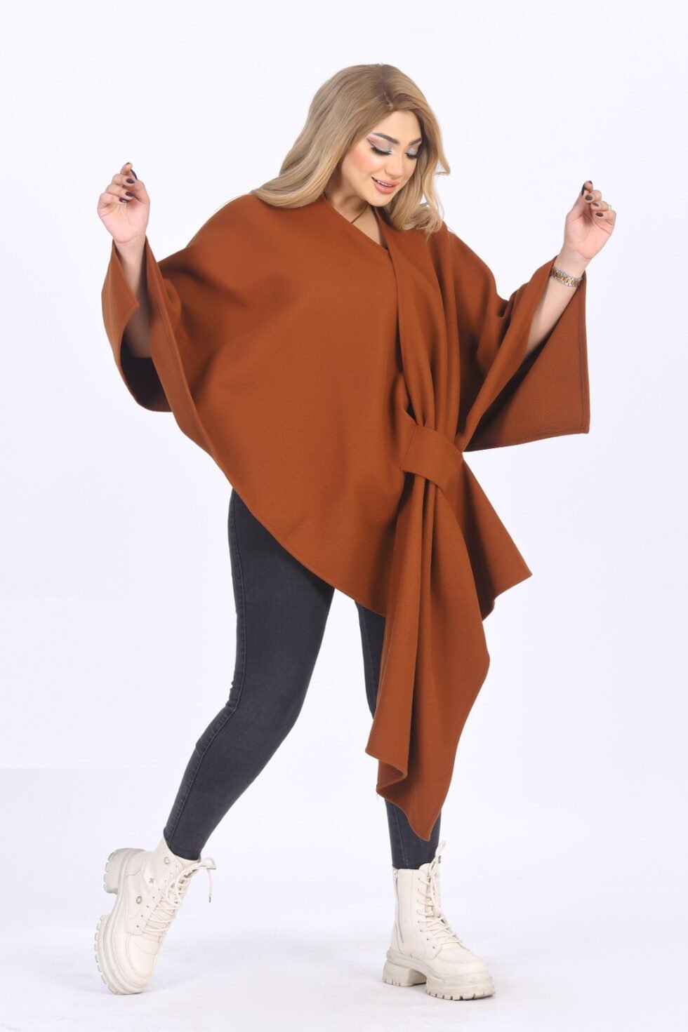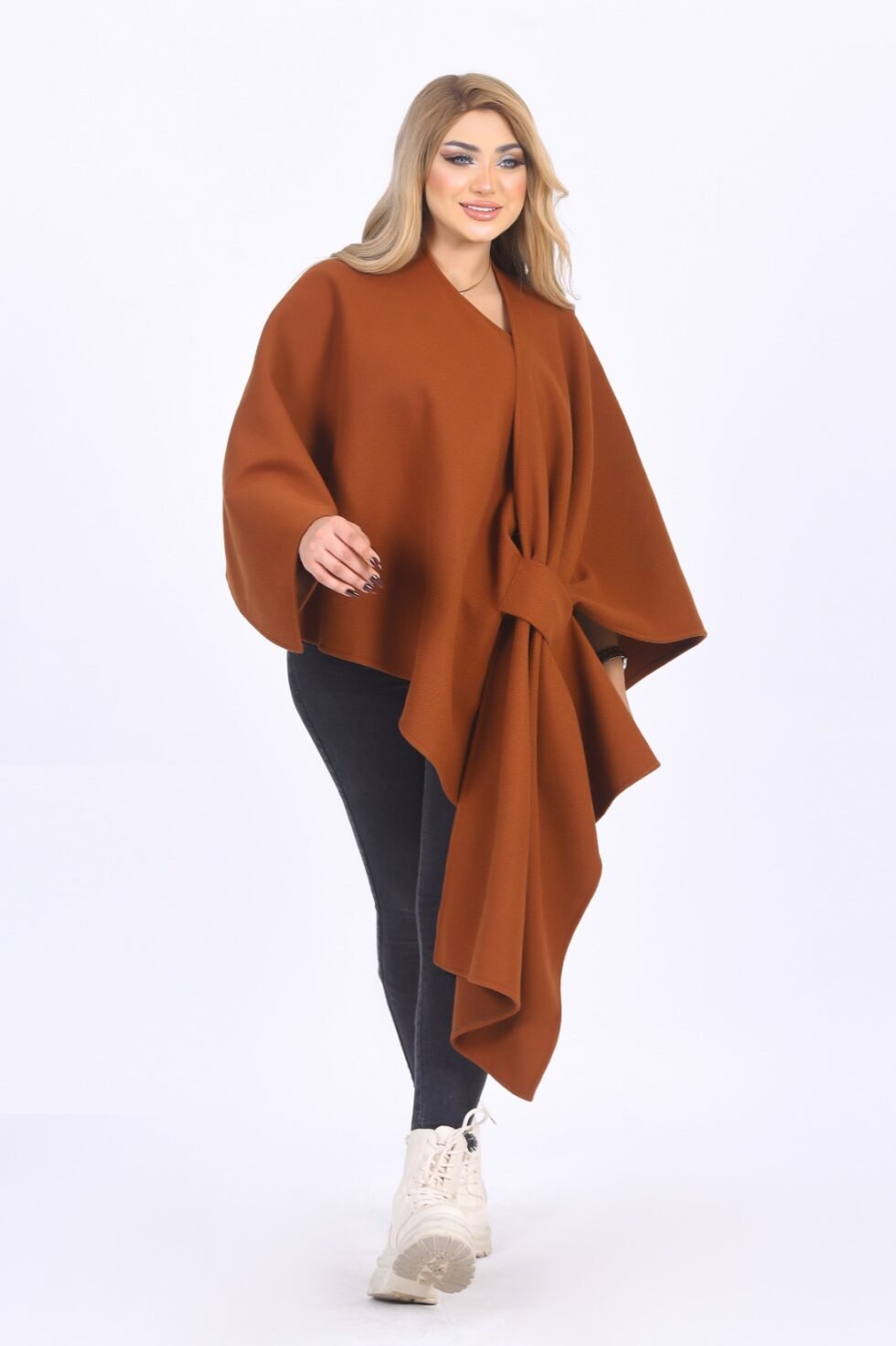 Stylish wrap shawl made from warm wool/jokh material, featuring a flowing cut with an adjustable front tie. One-size design suitable for all body shapes.